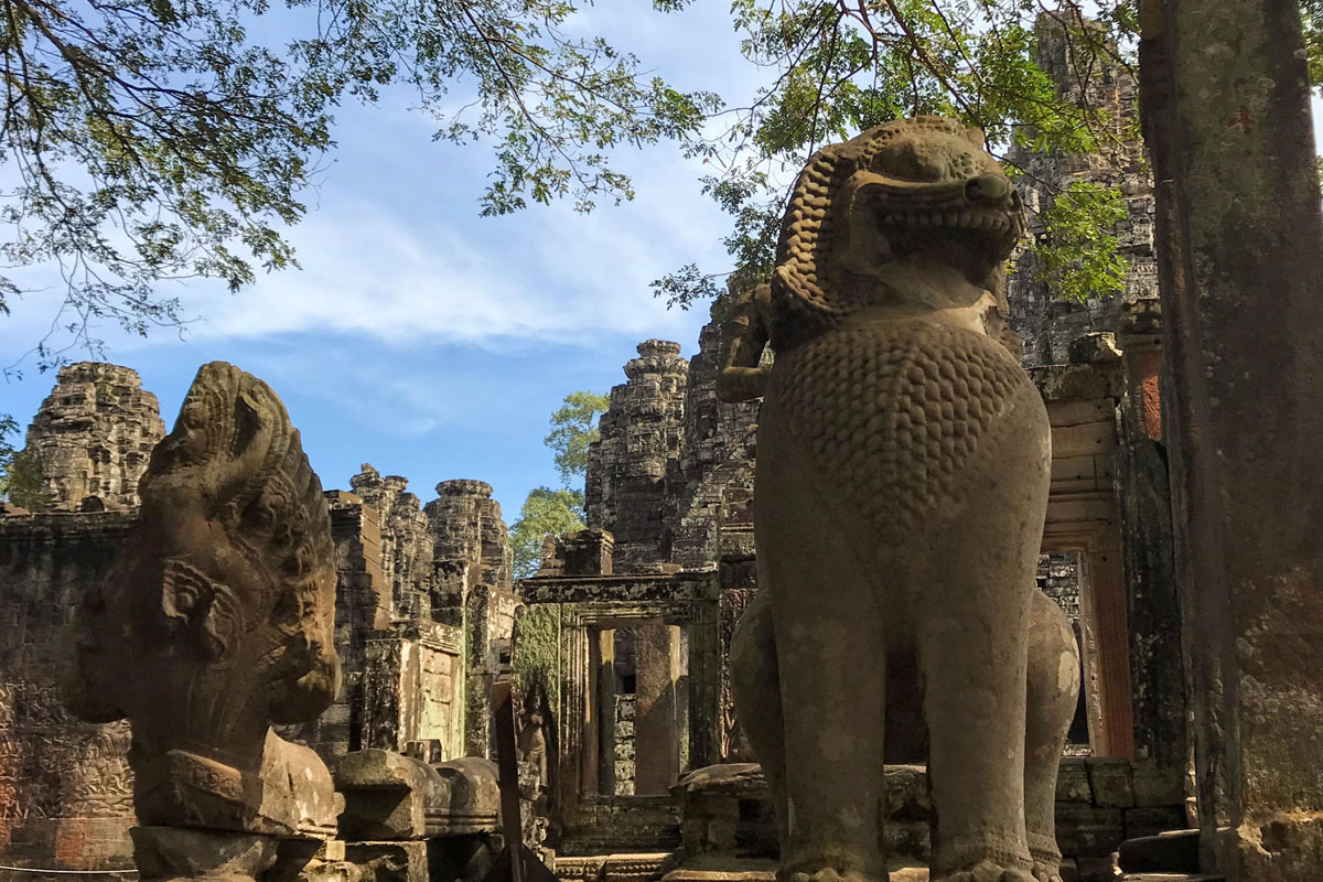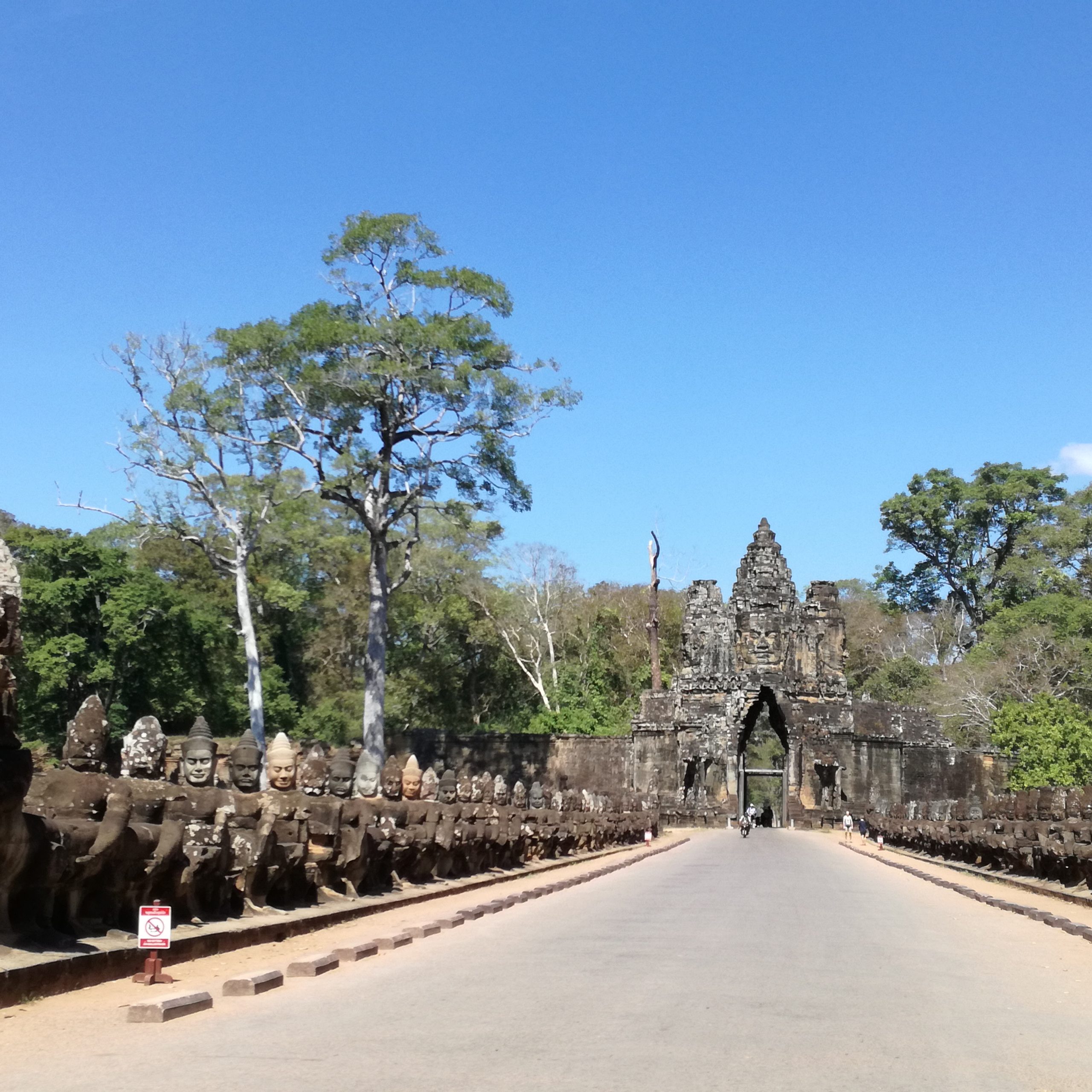 Travel onward to Angkor Thom, entering through its majestic South Gate.